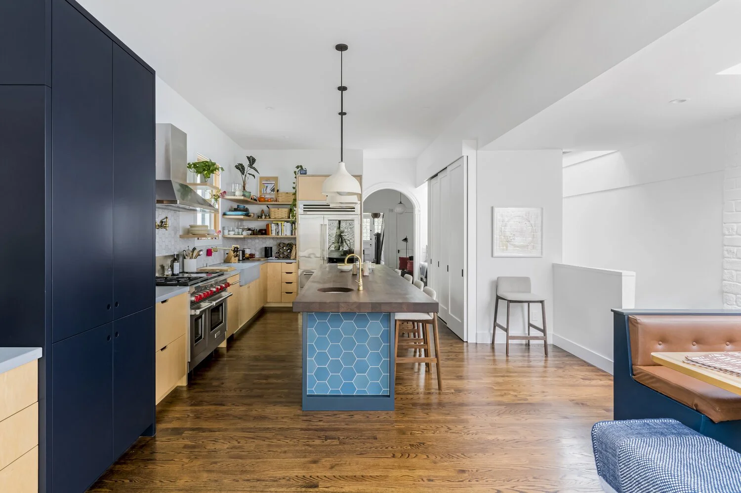 The Lower Pac Heights project features a banquette, floor-to-ceiling bi-folding steel frame doors and beautiful custom wood cabinets and wood details bringing warmth to the modern space.