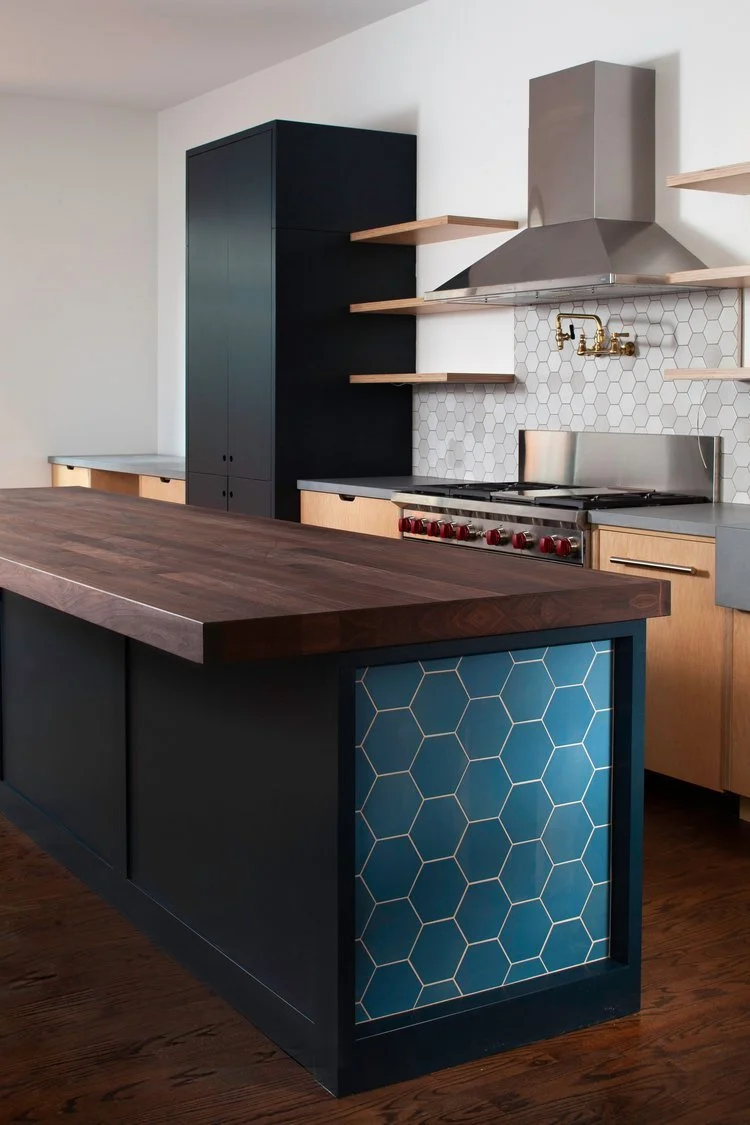 “This was a really unique project, more of an industrial feel,” says JT. We even made walnut countertops. We all liked it because it’s different and not the norm, and we love to do stuff like this.” he says. The cabinetry featured no knobs and pulls but instead, European plywood that’s exposed, drawer pulls that are integrated into the heads of the cabinets (most kitchens have handles on cabinets), and no upper cabinets, but instead shelves, creating a more professional, industrial kitchen look where everything is exposed (which is a dream for chefs or at-home chef enthusiasts!)